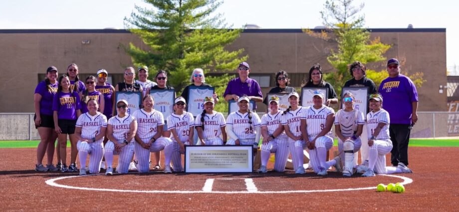 Before the second game, the inaugural 1998 Haskell softball team was honored with players and Coach Tanner being given goodie bags, a jersey they never got to wear, and a permanent reminder who made softball possible placed in the concourse.